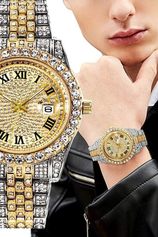 اگر به دنبال ساعتی هستید که در نگاه اول، توجه همه را به خود جلب کند، این مدل لاکچری نگیندار دقیقاً همان چیزیست که میخواهید. ترکیب رنگ طلایی و نقرهای در کنار نگینهای درخشان، حس اشرافیت و خاص بودن را بهخوبی منتقل میکند.